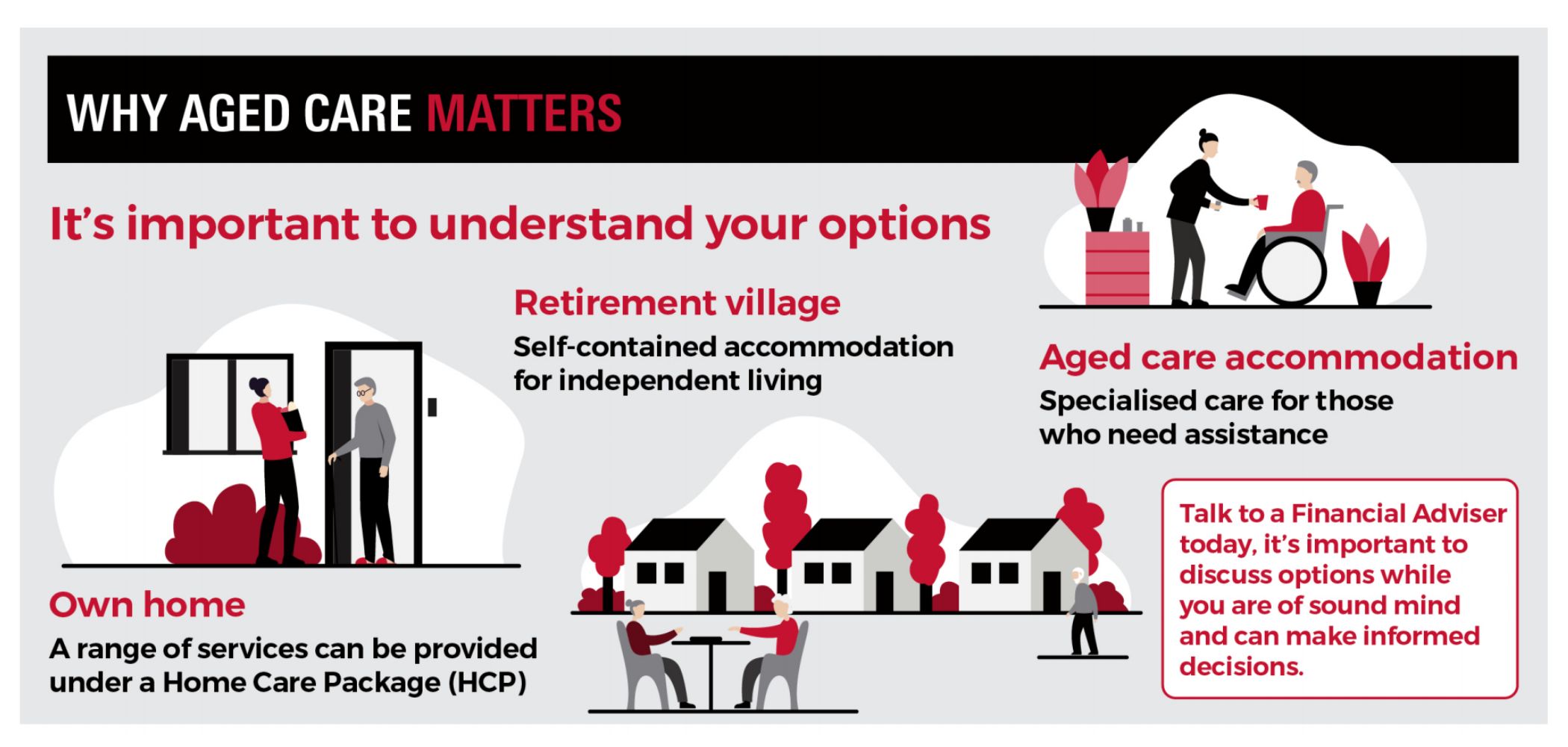 With so much to know about this very important decision around how you, or someone you care about, will live out their final years, it’s important to get all the facts from a qualified Financial Adviser who understands the aged care system and can provide options and advice, giving consideration to your individual circumstances.